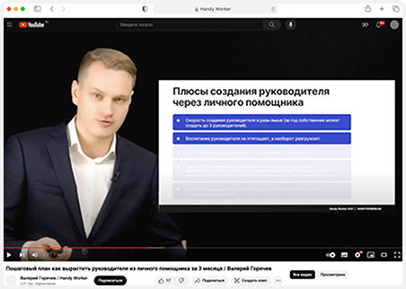 Видео-инструкция о том, как за 3 месяца подготовить личного помощника к роли руководителя с помощью пошагового плана.